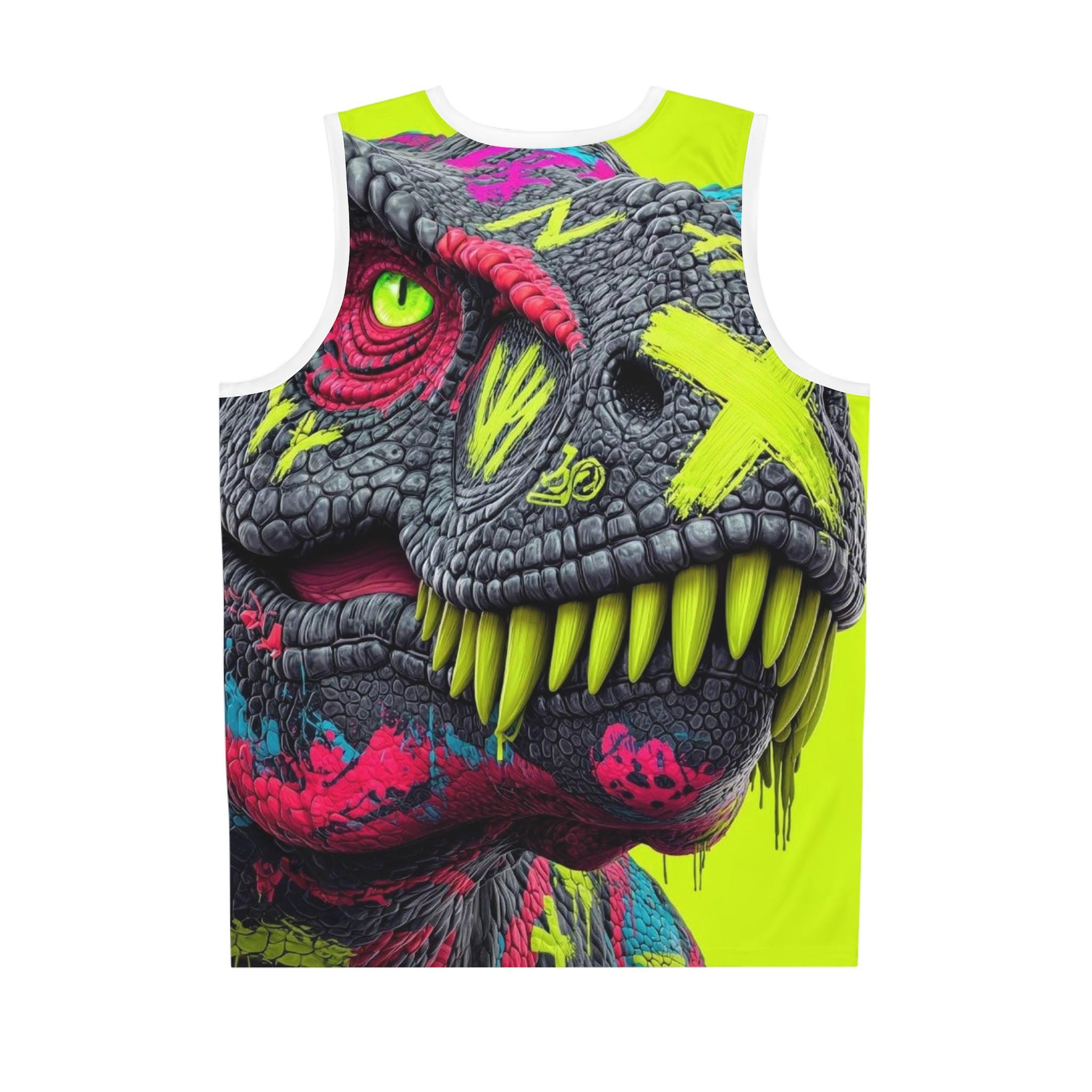 This all-over print basketball jersey brings bold street-art energy to the court and the block. Lightweight, moisture-wicking polyester keeps you cool as the neon dinosaur motif roars across the front and back. Double-stitched seams and side seams give it structure for game play, while odor-resistant fabric and a discreet care label inside the hem make it easy to wear day after day. The vivid, high-contrast design reads like a mural — fierce, playful, and unapologetically loud — for players who want their kit to reflect attitude and movement.