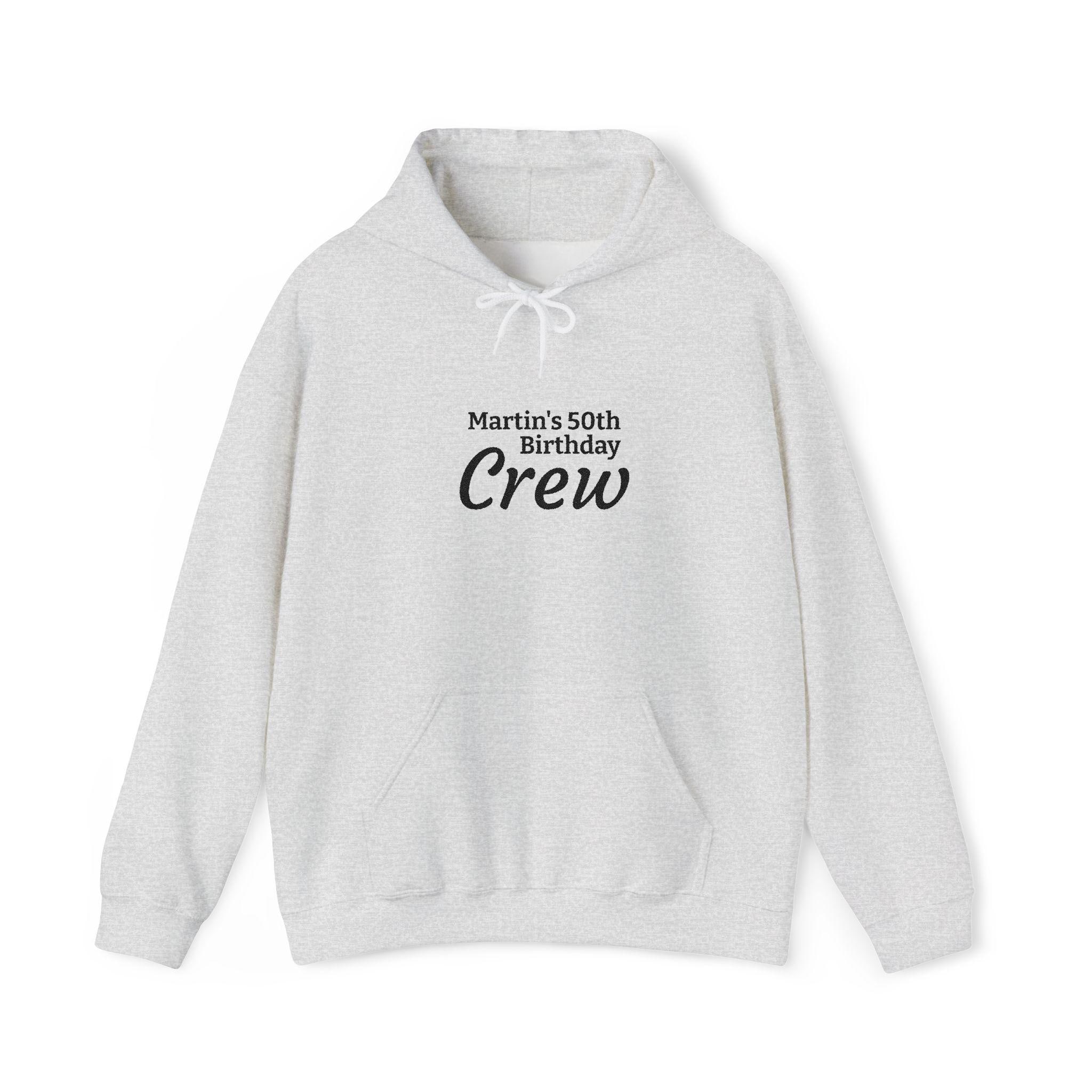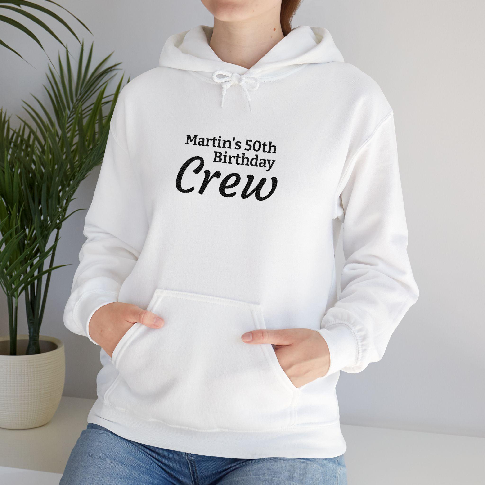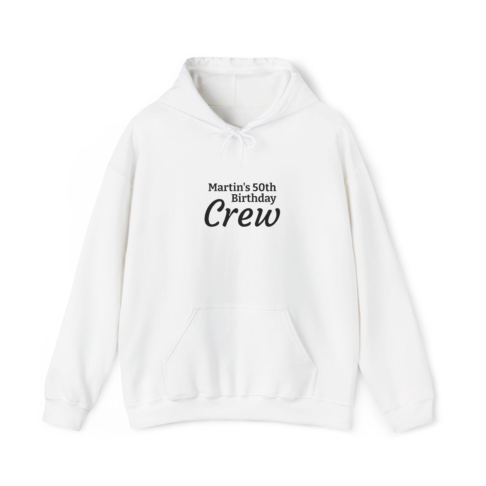 A soft, midweight hoodie built for casual days and celebratory weekends. The cozy 50/50 cotton-poly blend holds prints beautifully and keeps its shape, while the tunneled drawstring hood and roomy kangaroo pocket add practical warmth. This clean white pullover carries a simple crew-style text across the chest—subtle, wearable, and ready for group moments like birthdays or laid-back gatherings. It drapes comfortably thanks to a classic fit and tubular knit construction, and it’s finished with a tear-away neck label for itch-free comfort.